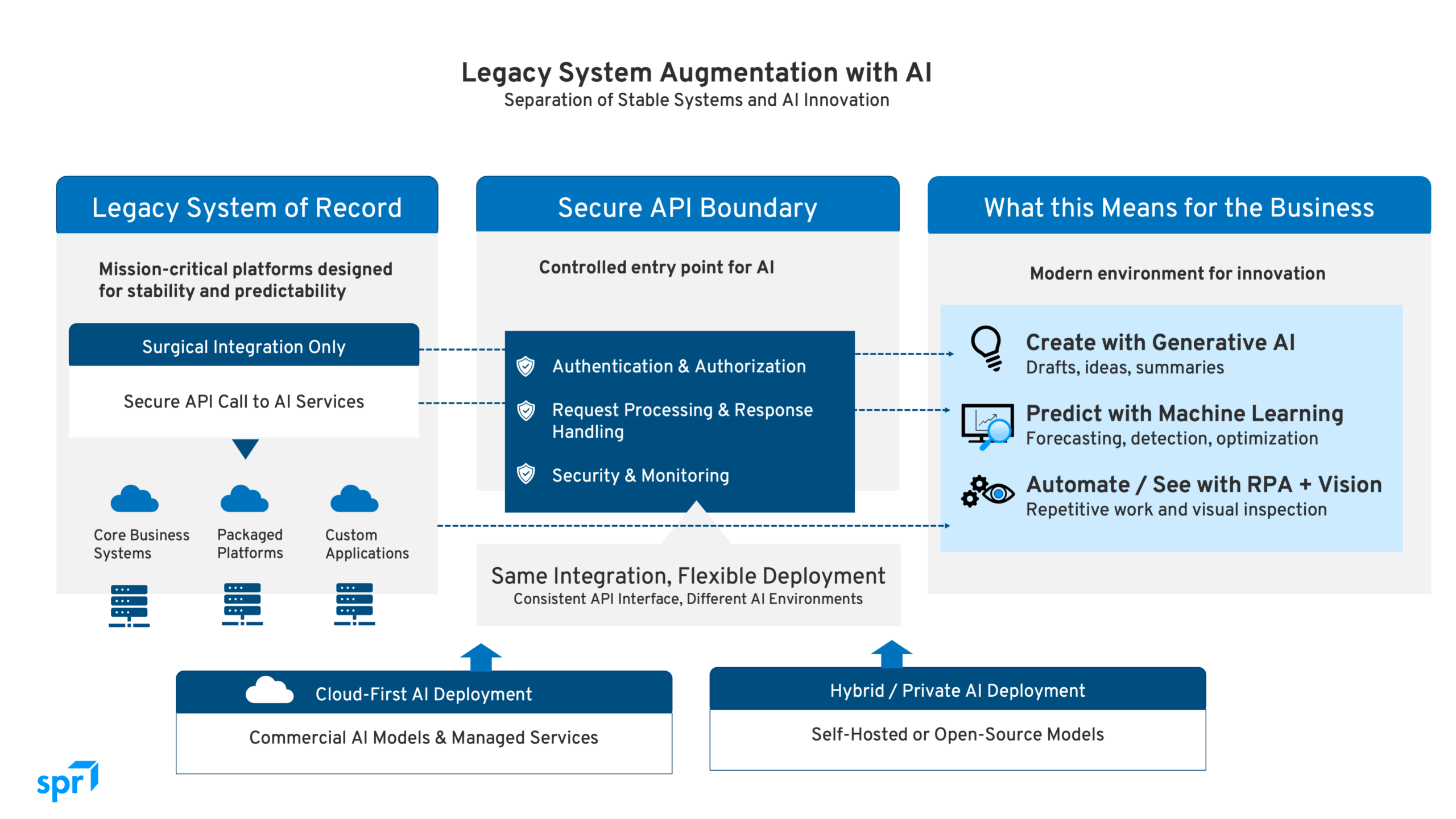 SPR provides legacy-system modernization services that help enterprises connect trusted operational systems to modern AI capabilities in a controlled, production-ready way.
