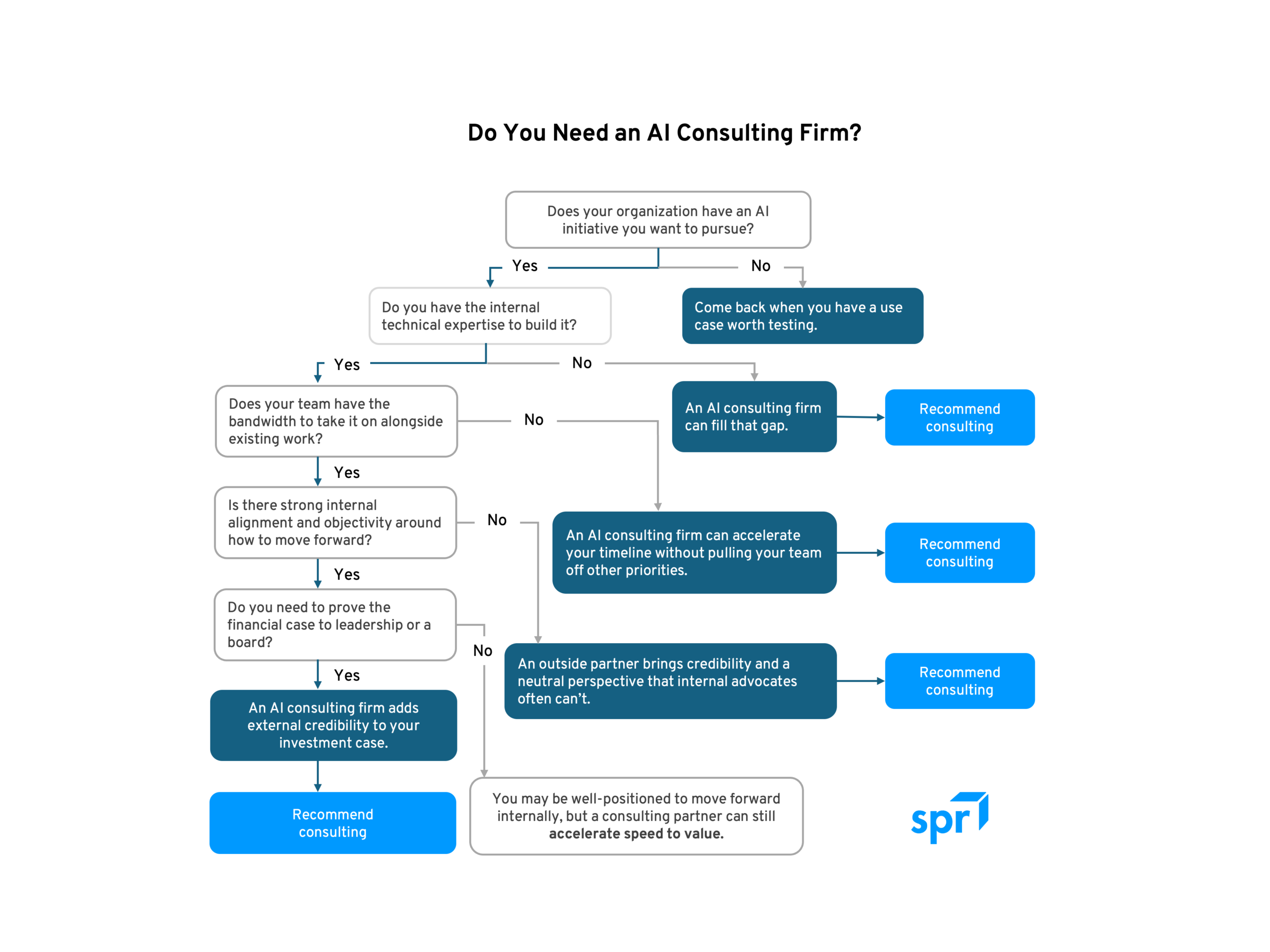 If you have the talent internally but not the time, a consulting firm fills that gap. If you need something done quickly, an outside partner can accelerate the timeline significantly. And sometimes, even when a company has both the skills and the bandwidth, an external firm brings something harder to manufacture internally: objectivity. Organizations with a lot of internal momentum, relationship dynamics, or competing priorities often benefit from a third party that can cut through the noise and get people aligned.