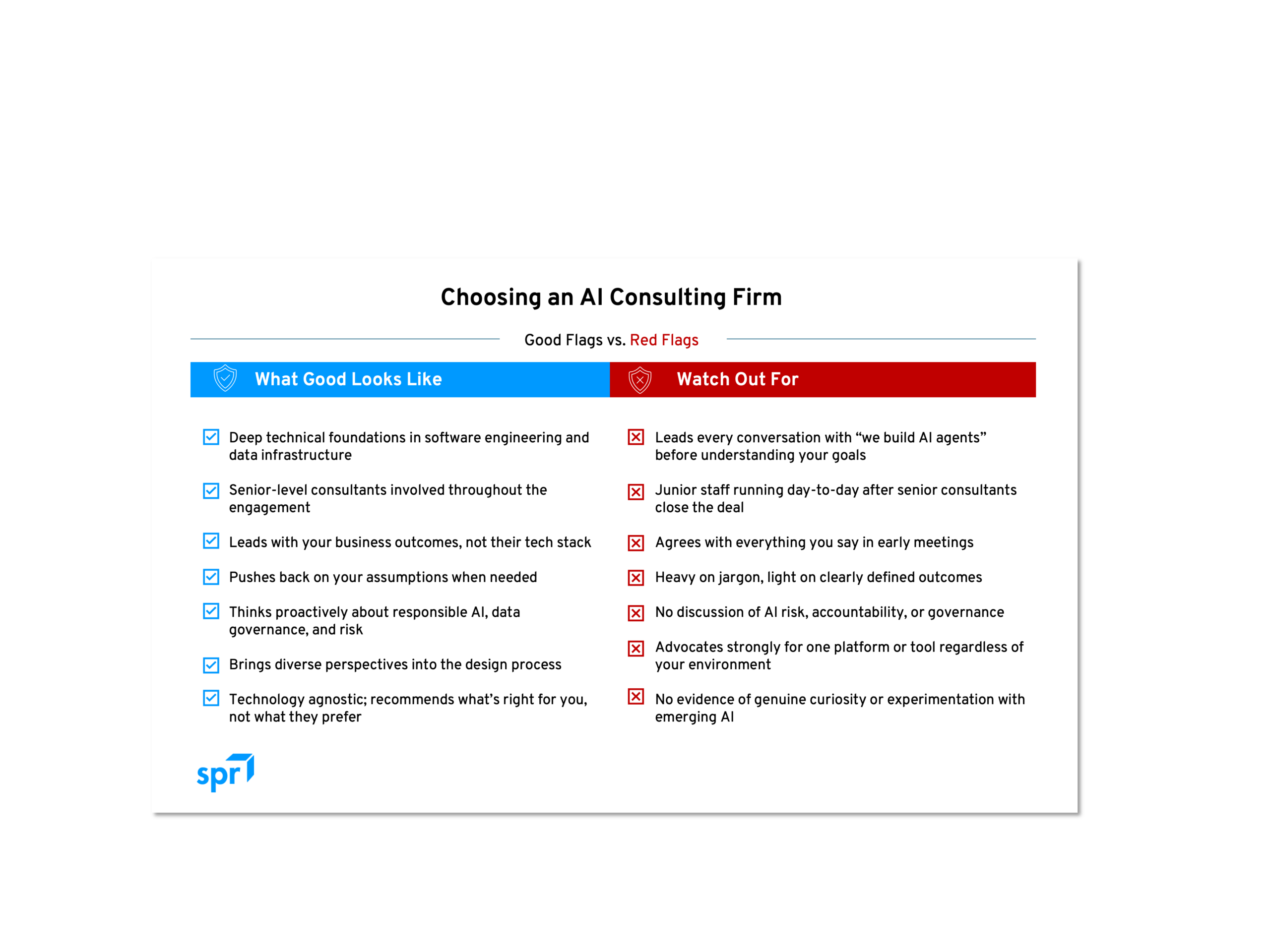 They’re not thinking about responsible AI. This isn’t just a values question; it’s a business risk question. AI systems introduce liability, accountability, and risk management considerations that didn’t exist before. A firm that isn’t asking those questions during the design phase isn’t protecting you. Look for partners who think intentionally about responsible use, including things like model selection, data governance, and the real-world implications of what they're building.